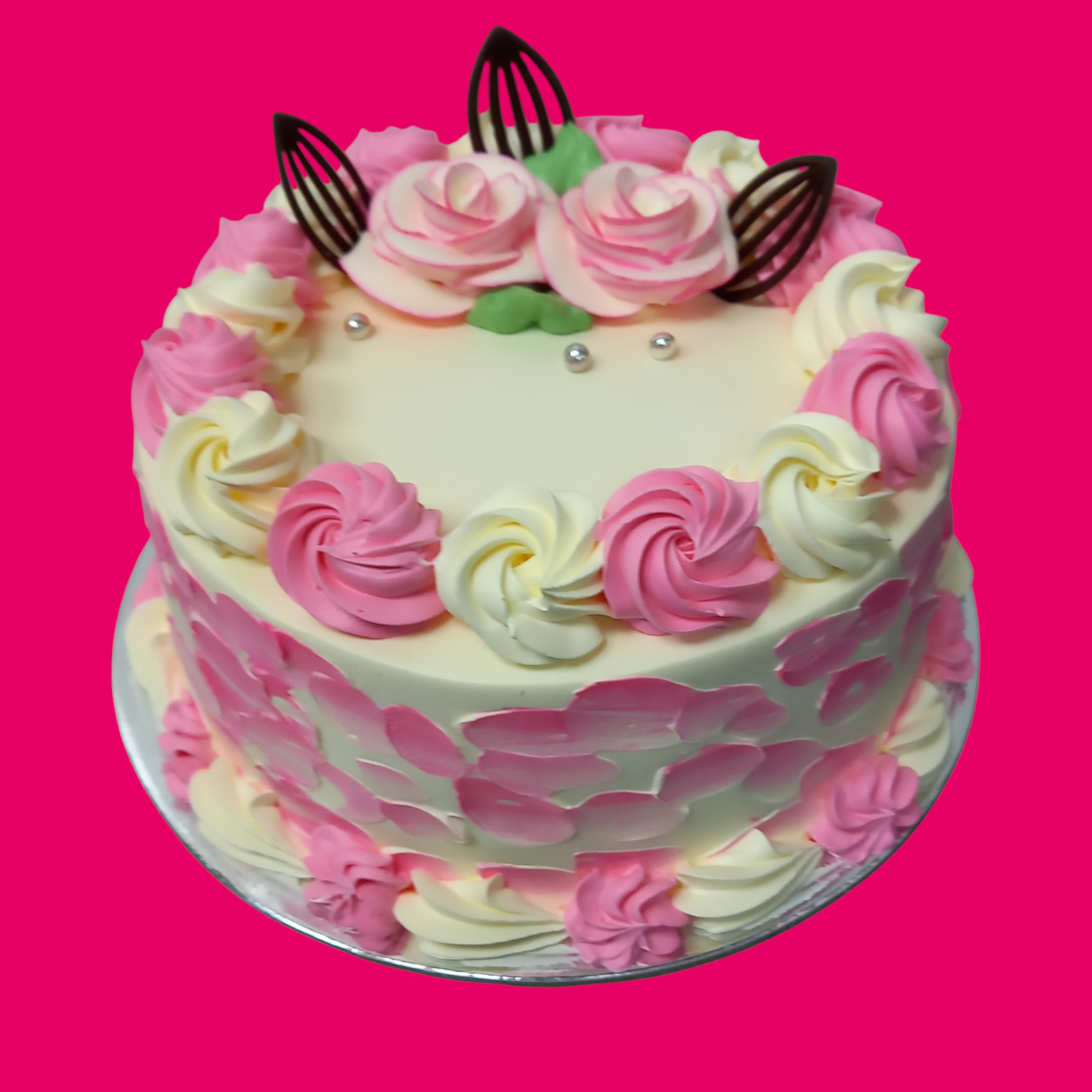 Our trending macaron cake comes with a sponge of your choice either vanilla or chocolate and filled with either chocolate or vanilla fresh cream.  Beautifully decorated with multi-coloured macarons, white chocolate stick, fresh cream swirls and a chocolate ganache drip.